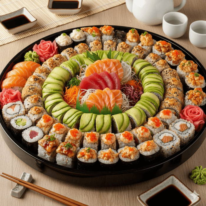 A combination of 8 Classic rolls, 2 signature rolls, 10 pieces of sushi, and 20 pieces of sashimi • Serves 10+ people